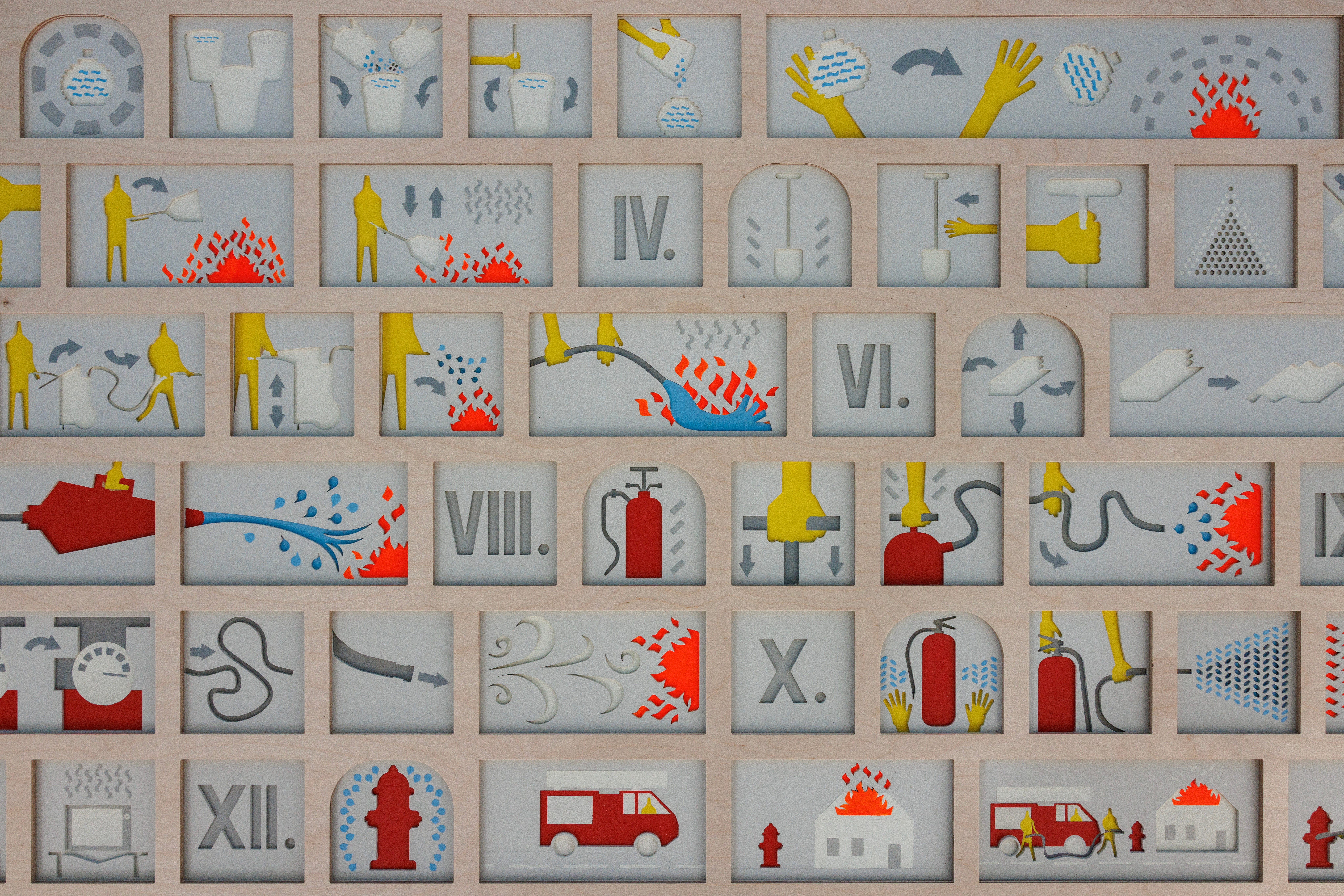 Three fire extinguishers are prominently displayed in their own niche each. One against a crunchy ultramarine blue to the right of the entrance. On the left, the fire extinguisher is positioned above a visualization of firefighting history. The backdrop is a bright sky with golden rays. The only thing missing is an angelic choir. In the central room, one final fire extinguisher is displayed in a shell and marble grotto niche as if replacing the sculpture of a saint. So blasphemous. So cheekily satirical.